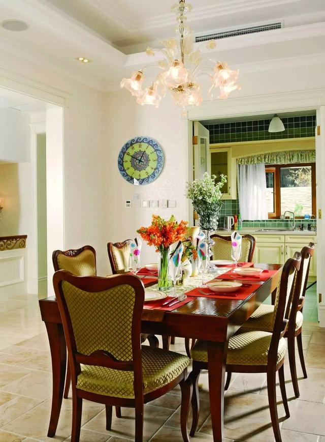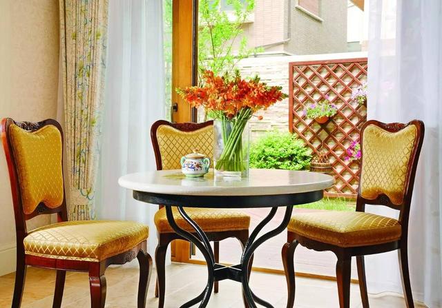 古典的栗褐色餐桌椅,襯得整體環境多了幾分韻味。鮮花點綴,春色撩人,好心情常在。