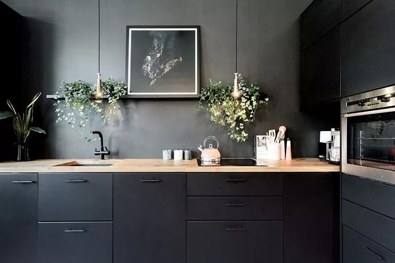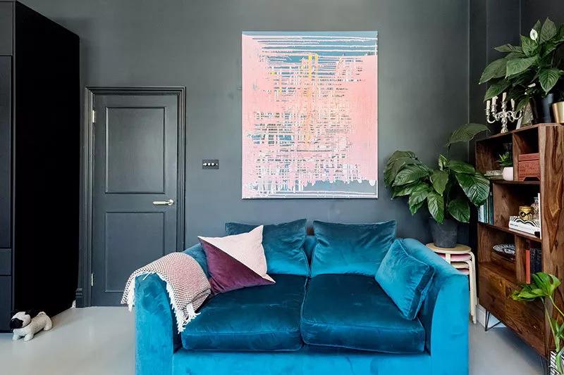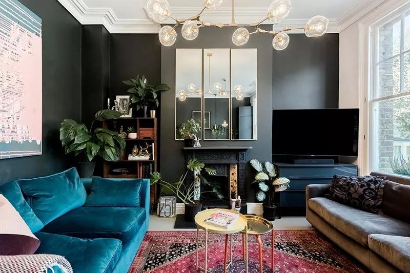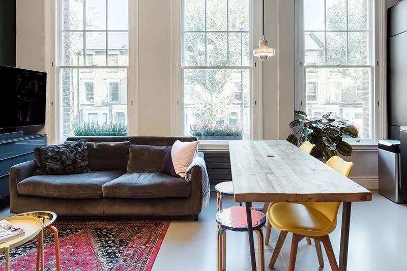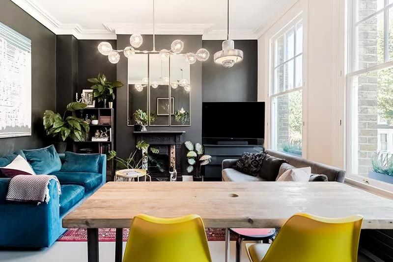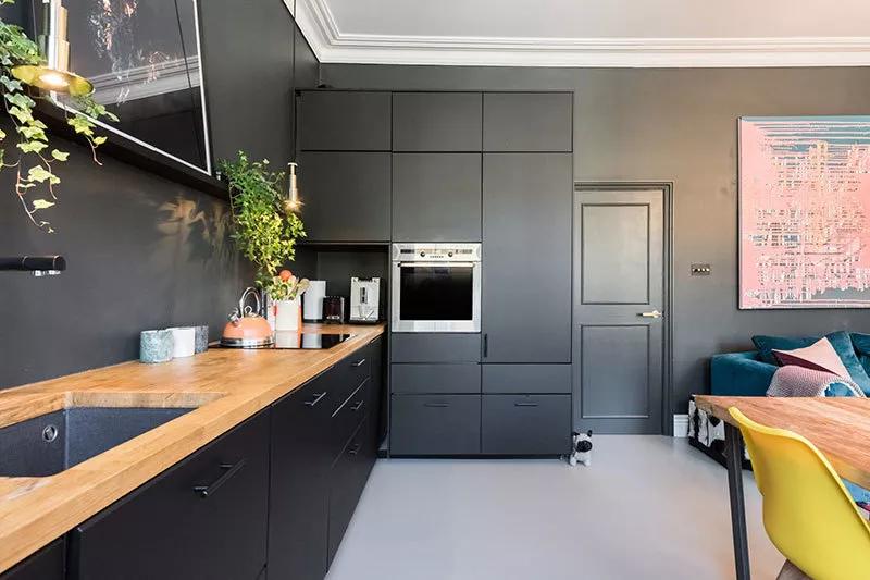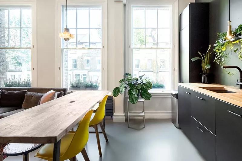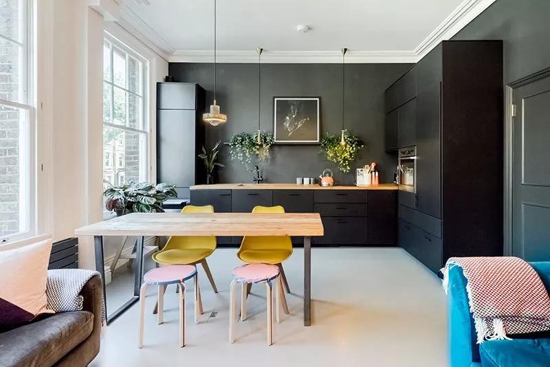 對比的手法,是倫敦這間時尚出租公寓室內設計的主要理念。首先,它體現在配色方案中 - 在客廳,墻壁是大膽的黑色,而地板則是全白。一個漂亮的舊壁爐也漆成了黑色,盡管它在這里提供了相當的裝飾功能。除了配色外,還清晰地感受到風格的對比 - 現代化的廚房采用流暢的形式,經典的墻面裝飾和壁爐,還有閣樓式餐桌。