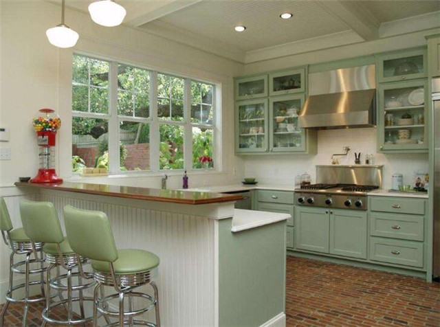 廚房、餐廳的家具無論是訂做還是購(gòu)買,式樣款式盡量選擇簡(jiǎn)單的,避免選擇雕刻繁瑣的中式家具、藤編、柳編類家具和布藝沙發(fā)及餐椅,以便于清潔。為了美觀與安全,開放式廚房臺(tái)面不要放過多的炊具,所以儲(chǔ)物的櫥柜應(yīng)盡可能大些。