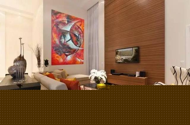 2 | 這款客廳的風格相對熱情一些,而讓這種氛圍顯得更濃厚一些的是墻上這幅掛畫。這是居住者的個人喜好,也算增添了一些藝術的氣息。現在比較流行的做法就是將電視掛在背景墻上,像這款設計一般。這里甚至將電視柜與墻融為一體,木質感看上去也比較連續。