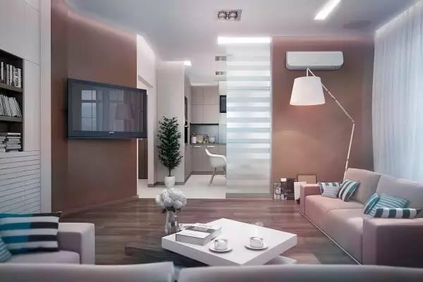 4 | 淡酒紅色其實一種溫柔的顏色,喜歡簡約一點設計又不太喜歡過于冷清的顏色的朋友可以考慮一下這樣的"芋頭色“帶來的軟糯溫情的空間氛圍。這款客廳與旁邊的餐廳用磨砂玻璃墻半隔斷開來,制造了一個相對獨立的環狀空間,電視墻與L型沙發布局以對角線設計布置,兼顧兩側看電視的人。