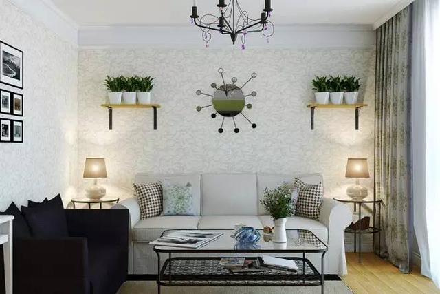 3 | 這款簡美風格的客廳裝修,用帶暗紋的白色墻紙渲染了家居寧靜舒適的氛圍。墻上的鏡面裝飾很有特色,兩側設計對稱式的隔板各放上三盆凈化空氣的小植物,為室內帶來一絲清新。這是個低彩度的空間,因此照片墻的設計也相對選用了黑白灰色。
