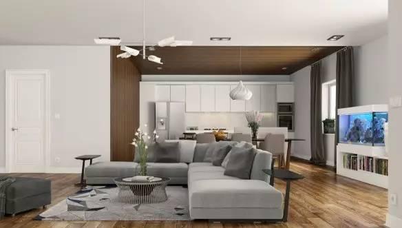 10 | 這也是一款相對開放的客廳,絨灰布藝沙發搭配木質地板。如果想要客廳多些生氣,不妨像這款客廳設計般,在墻邊的藏書地柜上擺上一個魚缸,盡顯生機,對于調和風水也有一定的益處。