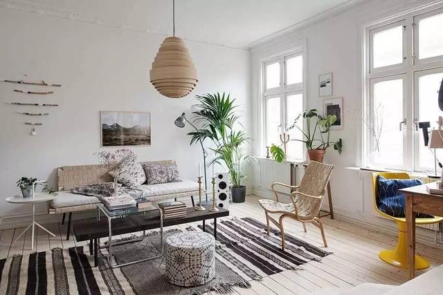 7 | 這款客廳設計自然氣息很濃厚,除了大大小小綠色植物的功勞,還有它的各類選材。像竹藤椅就顯得非常純天然,吊燈的造型設計也選得很巧妙,像一個吊著的蜂窩。編織類的各類布藝軟裝圖案豐富,但選色相近,所以看上去沒有違和感。