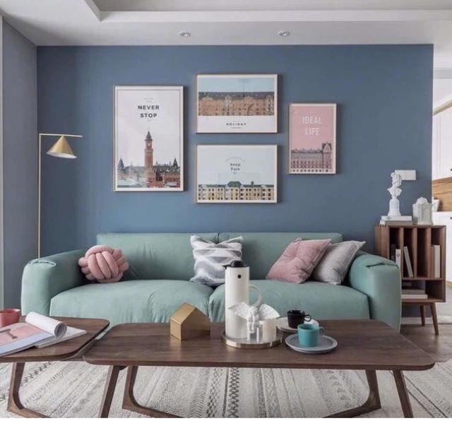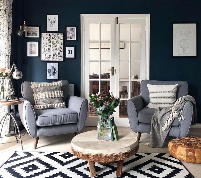 如果是小戶型客廳,墻壁的顏色可以選用深藍色,因為深色系并不是只有黑灰。然后用掛畫的方式來進行提亮,至于沙發可以用灰色布藝,這樣就不會因為顏色過深,而導致讓人感到很壓抑。