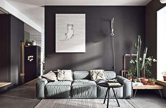 因為深色的墻壁和沙發看上去會顯得莊重一些,所以最好能有編織材質的抱枕或者沙發毯來中和,而這時候茶幾就斷不能用黑色了。