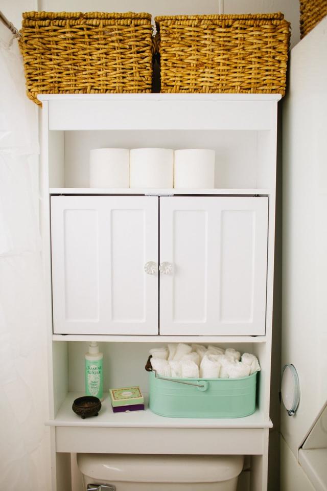 把儲(chǔ)物籃變成架子,為你的浴室增添一點(diǎn)獨(dú)特之處。他們是完美的,因?yàn)槌钟蓄~外的毛巾靠近水槽,但不礙事。你可以把架子掛在馬桶上方,用一些不僅有用,而且很有創(chuàng)意的東西來填補(bǔ)這個(gè)空白。