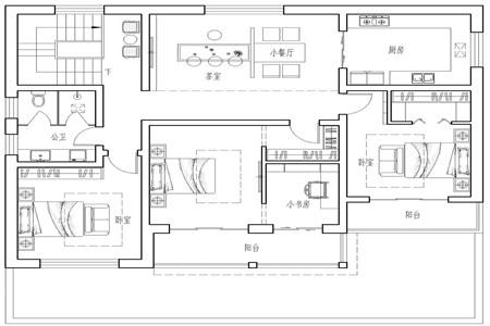 上樓處合理的流線設計,讓二層的茶室形成一個較為完整隱秘的空間,使用感非常好。二層總共有三個臥室,臥室朝南。中間的主臥還帶有小書房,既可以工作也可以學習。此外臥室還有室外平臺,可以作為觀景或晾曬的空間,豐富了房間的整體功能。