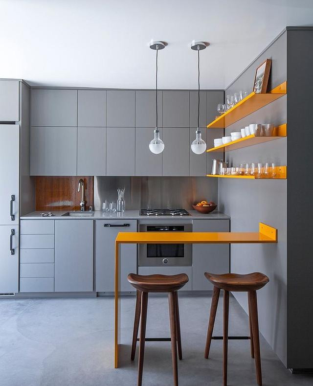 小廚房通常只有很少或沒有櫥柜空間,如果它們有額外的櫥柜,那么傳統(tǒng)上它們太大,或者占用太多。為了消除體積過大,大多數(shù)櫥柜都增加了開放式貨架系統(tǒng)。開放式擱架將消除房間的沉重感,帶來無縫通風(fēng)的感覺。