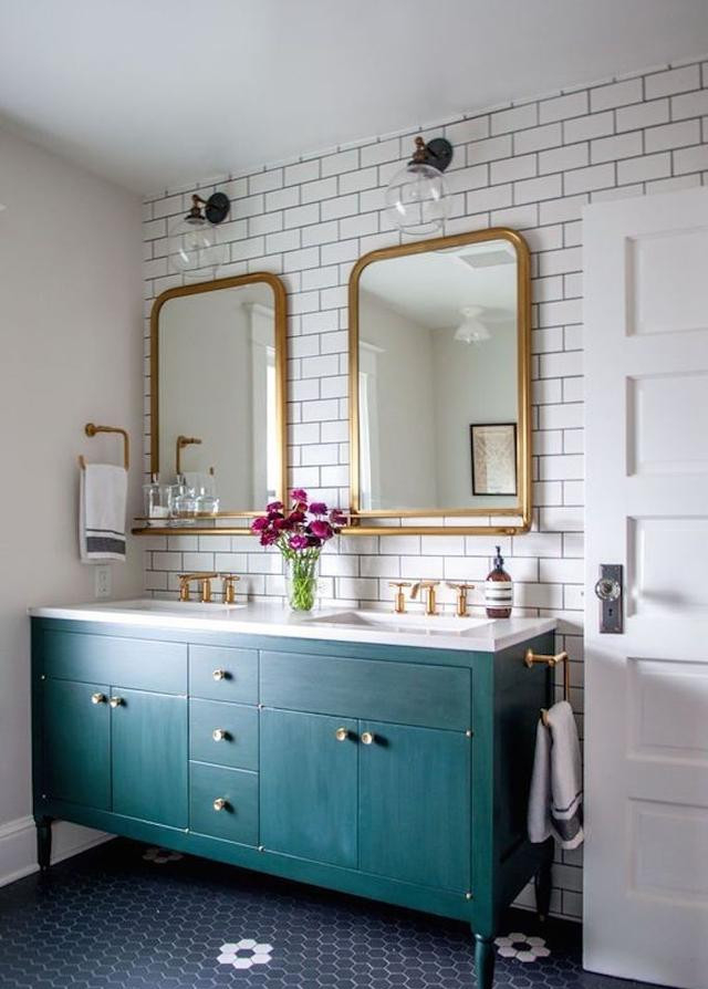如果你想找一種方法把一些顏色帶進浴室,那就用錘子和手來看看這個設計。在這里,我們看到了一種豐富的水鴨色調,它覆蓋著櫥柜和金色五金件。它是一個相當拋光和獨特的飛濺。