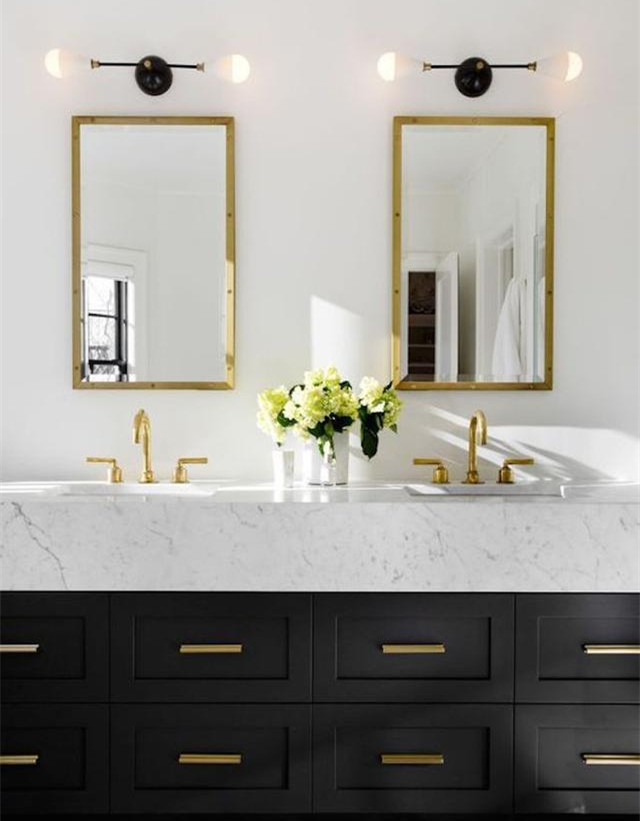 黑白一直是經典的顏色組合,這條規則適用于所有美學。你可以在Elle Decor帶給我們的浴室里看到它是多么的漂亮。大理石臺面與黑色櫥柜和金色五金件形成了美麗的對比。