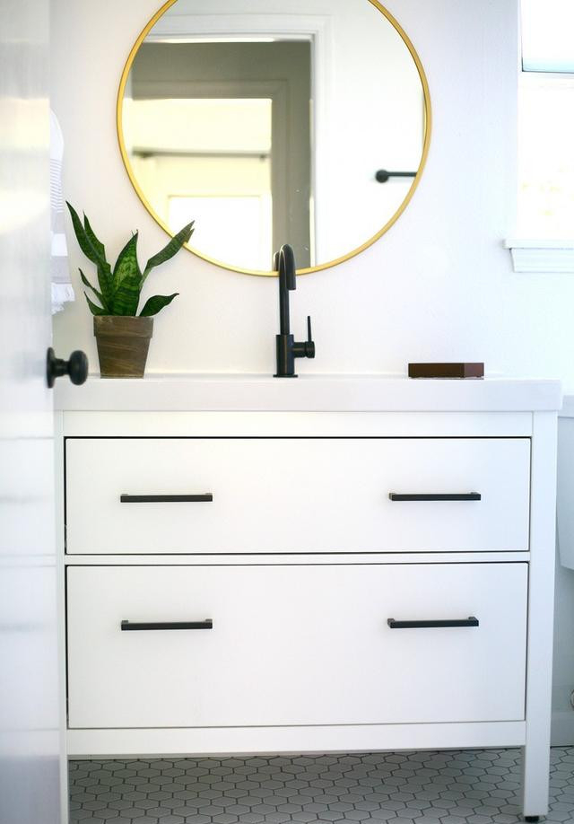 DIY網絡與本世紀中葉的現代感相得益彰。我們又看到大理石臺面和當代的黑色五金件。這些櫥柜看起來像是一件經過升級的古董——給我們提供了設計和DIY項目的新想法!