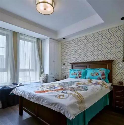這個房間布置的很有味道,經(jīng)典的美式雙人床搭配帶有民族特色的床飾,簡單又富有個性。少了一份美式的厚重感,多了一份別致的格調(diào)。在飄窗旁邊還布置了一個小的收納柜,增加了儲物空間,也不會影響采光。