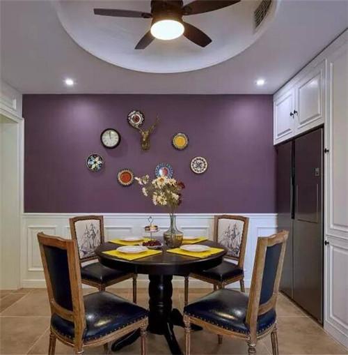 客廳和餐廳相連,一眼望去,使空間看起來更加寬闊明亮。圓形的吊頂搭配圓形的餐桌,兩者和諧呼應,也營造出一種其樂融融的溫馨氛圍。主人在這個空間里做了壁柜,將冰箱融為一體,使餐廳看起來更加整潔舒適。