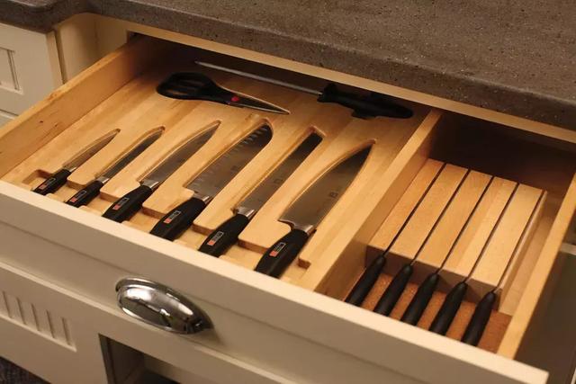 備菜區一般位于水槽隔壁,所以砧板和刀具的收納位置,設置在水槽附近的抽屜或者臺面上最為便利,把菜洗好后切好后,將殘余物丟棄到容納垃圾容器的水槽中心。