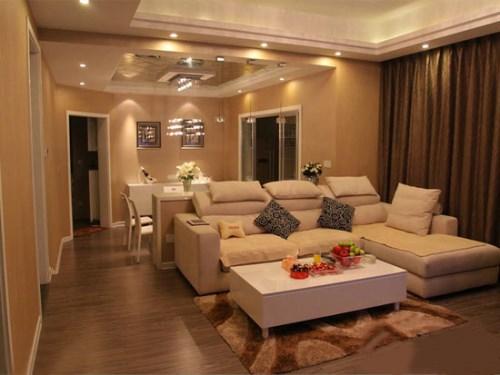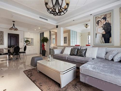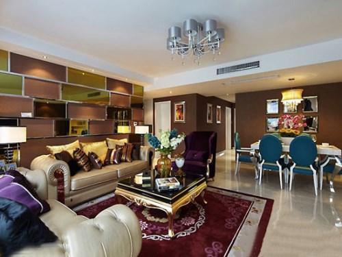 顯而易見,這是一款新古典主義風格的設計,整個空間在唯美顏色的烘托下既高雅又富有色彩。特別是沙發背景墻的設計,利用鏡面作間隔設計,很新穎。餐廳則是以藍和白色為主,使得餐廳和客廳更加的新潮、唯美、氣派。