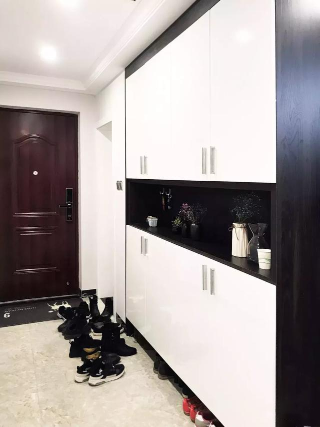 ▲進門左側小空間,定制了個鞋柜,考慮到實用功能,特意將鞋柜底部留空,可放常穿的鞋子。(不過家里人多,而且老鑫常常因為出入方便將鞋子隨意放門口,顯得有點凌亂了~~)