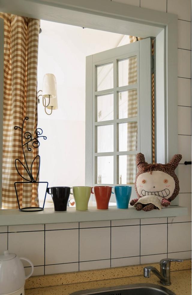 廚房洗手臺上特別開了一盞小窗與臥室相連,臥室窗簾同樣也選用了簡約的經典格子與百搭的白紗,打開窗讓空間更有層次感。