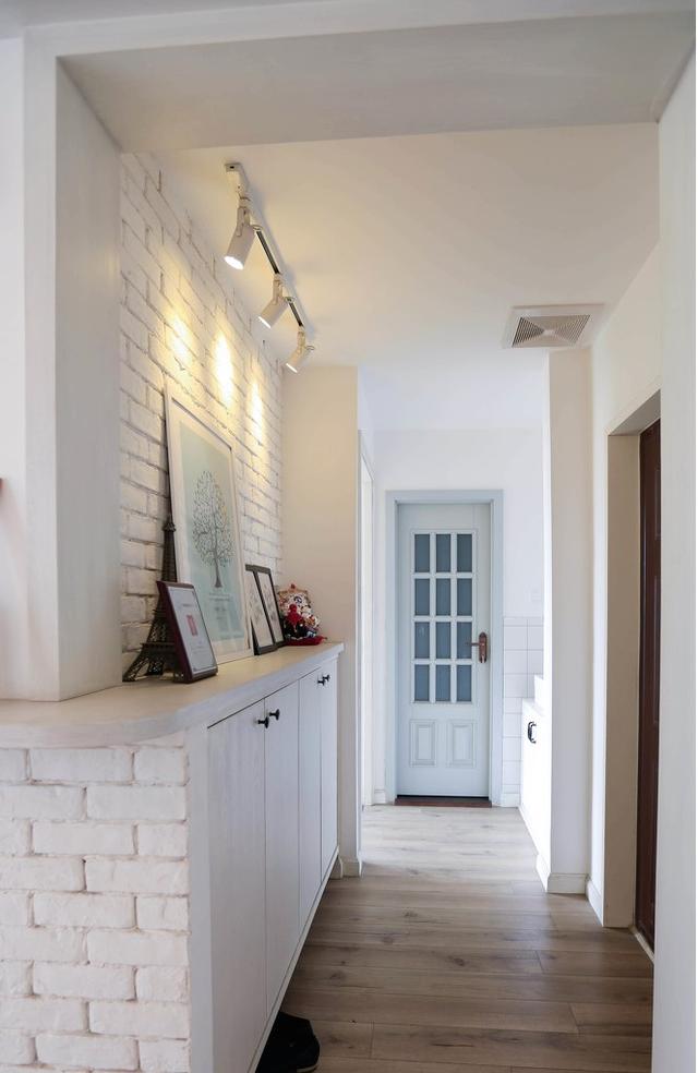 玄關的設計上,定制了一組玄關鞋柜,方便收納鞋子。墻面選取了粗糙質感的白色文化磚,隨意的鋪貼更突顯出北歐風的輕松自在。