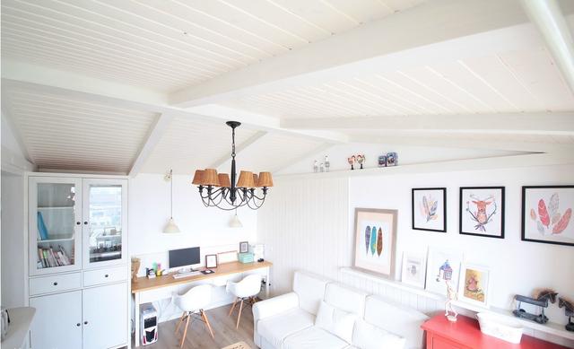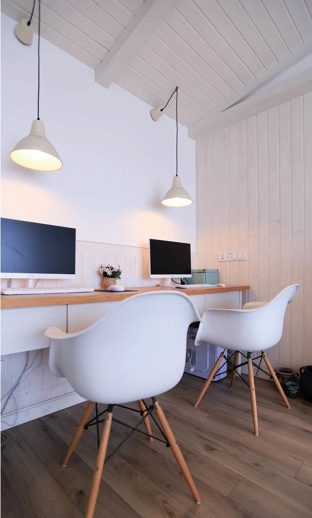 由于業主是自由工作者,特意在家劃分出一個辦公區,選購了一張雙人原木書桌作為辦公桌,掛上兩盞灰白色吊燈,簡簡單單打造了一個舒適的工作環境。