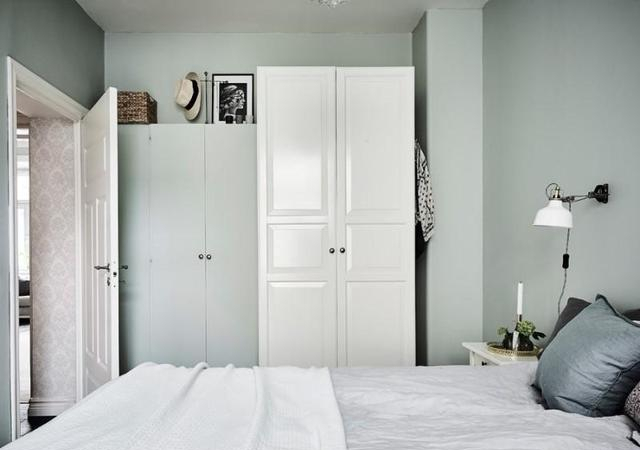 玄關的旁邊一間房就是我們的主臥室,淡綠色的背景墻,讓人眼前一亮,瞬間有一種很清涼的感覺,臨時組建的床頭柜也被擺滿了各種小裝飾來溫馨室內,簡簡單單的裝飾卻不失溫馨的美感。