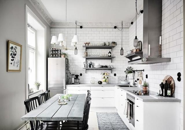 角落里的小廚房,被貼滿了小白磚,時刻保持著干凈整潔的環境,這一切看來都是特別的簡單,然而略帶復古的餐桌就這樣插了進來,打破了廚房內的和諧風格。