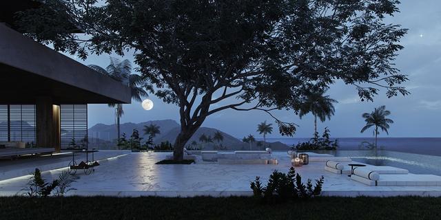 首先是我們三個別墅中面積最大的這個。客戶簡報要求實現簡化的地中海建筑設計。作為回應,流線型的積木被堆疊起來,以創造房子的現代形狀。戶外家具保持低矮而時尚,戶外談話坑沉入泳池庭院。