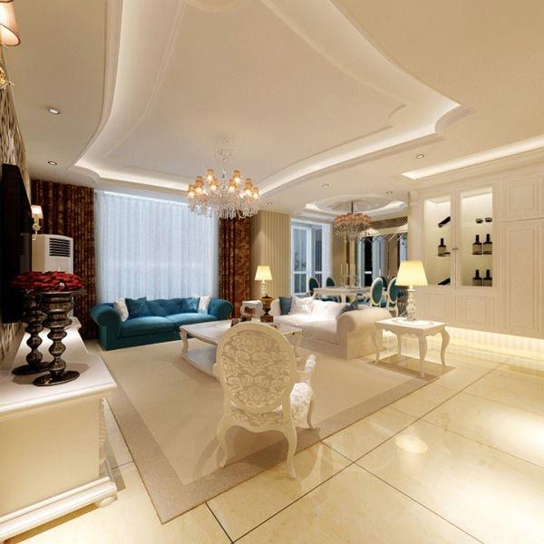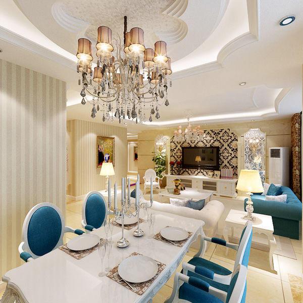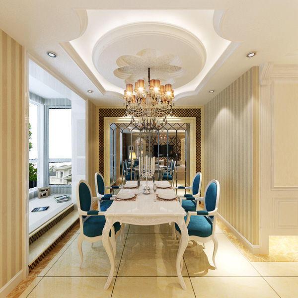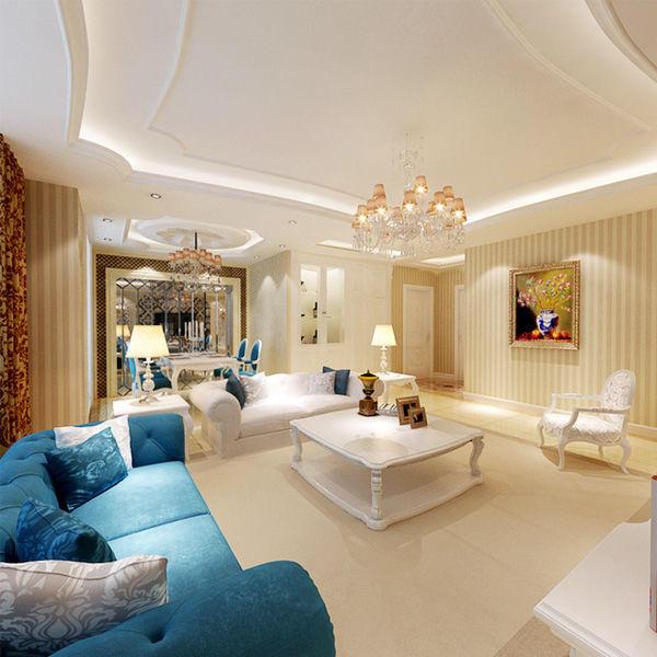 客廳墻上以豎條狀的米咖相間壁紙進行裝飾,頂面的不規則形狀十分新穎。歐式的精美吊燈搭配在這個簡約卻不簡單的客廳之中,十分和諧,頗具美感。藍色的沙發,在華美的客廳之中,盡顯高貴冷艷,與餐廳的餐椅遙相呼應。