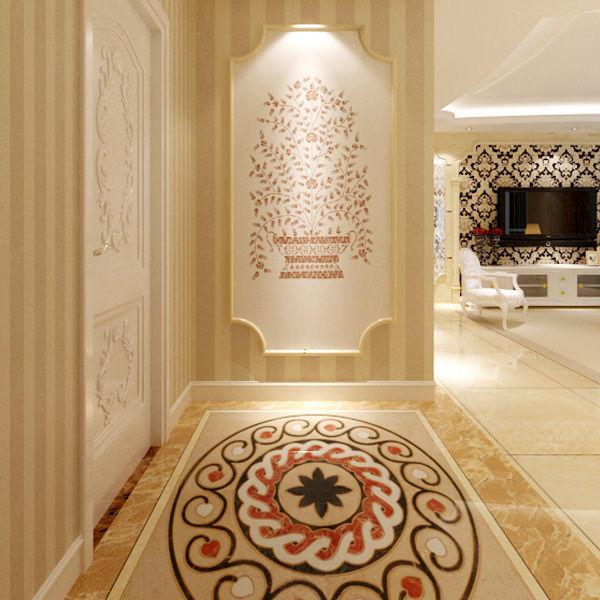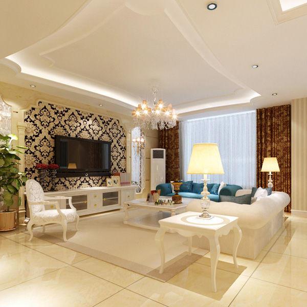 客廳的地上以米色大理石紋絡狀的瓷磚鋪貼,暖色的襯托,更顯溫馨與舒適,顏色與四周的米咖相間的壁紙相協調。而電視背景墻上的黑色花紋,在米黃色背景色下,有一種神秘的美感。