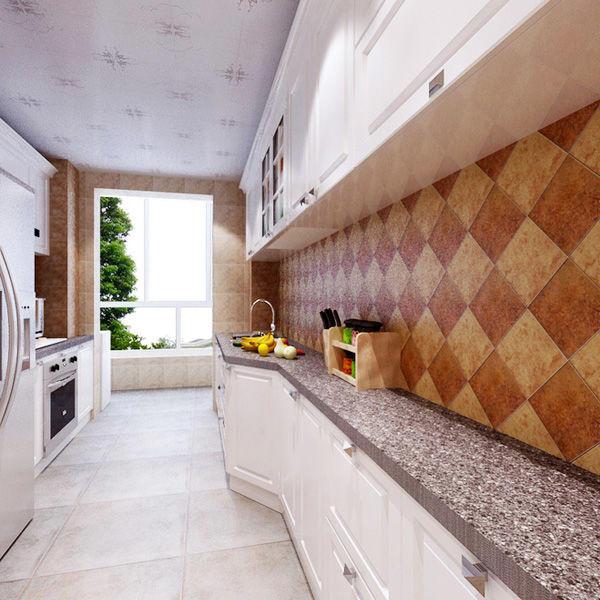 簡潔大方的廚房之中使用白色的整體廚房,簡潔大方之感油然而生。墻面上以深淺咖色菱形瓷磚鋪貼而成,空間區域很好的進行了區分,廚房也更具暖意。