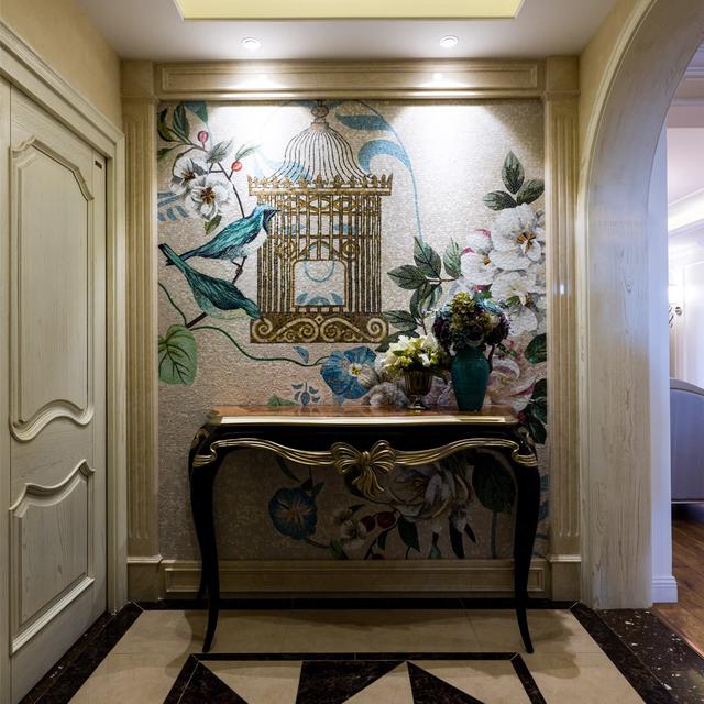 首先,我們一起來看一下玄關的效果。打開進戶門,映入眼簾的便是一面精致的端景墻,歐式風格的裝飾線條搭配著定制的中國風裝飾壁畫,寓意十分美好!吊頂部分做的是燈池吊頂,利用燈光效果,讓玄關區域看上去更加亮堂!燈光打在有金屬材質的玄關柜上面,閃閃的看上去有一種金碧輝煌的感覺,看了這樣的玄關效果,讓人忍不住心情敞亮,哪怕工作再累,一回到家就讓疲憊煙消云散了!