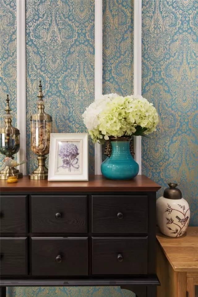 ▲過道的一面做了照片墻,這樣空間會更有層次,走到底的墻選了油畫效果的墻紙,與主體的色彩和風格也比較搭。