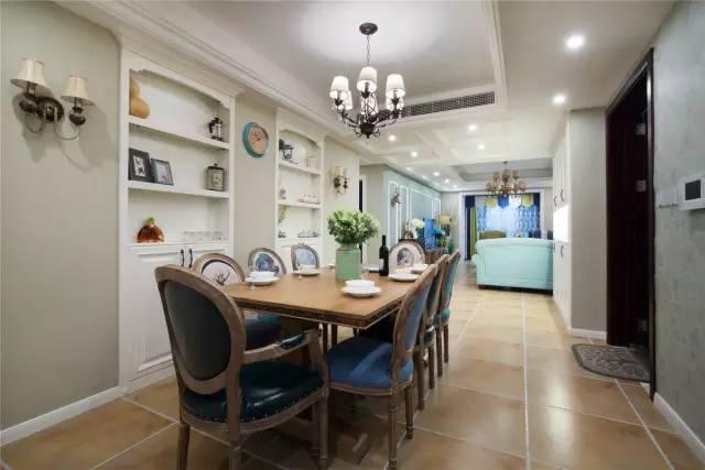 ▲略帶復古木色的家具,與仿古磚的色彩呼應,避免純粹藍色帶來的冷的視覺,與陽光沙灘藍天白云的干凈更為接近。