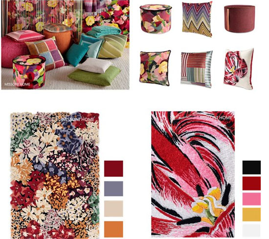 天香紅作為2020年的關鍵色彩,自然少不了符合季節氣氛的表現。著名意大利品牌MISSONI HOME有著充滿想象且大膽的色彩運用,紅色的應用更是豐富多彩,這得益于品牌精湛的工藝技術。紅色在MISSONI家紡產品中有著多種色彩組合。Dancing Flowers系列中抽象為幾何形態的花卉圖案,憑借紅色與草綠色的補色對比,粉色與淡黃色的襯托,加上天鵝絨材質與黑邊流蘇裝飾,讓整個系列充滿勃勃生機。Stripes Mosaic系列以線性條紋和色塊拼接圖案為主,WINSLOW和KEW靠墊以紅、黃、紫、豆綠等多色組合提花為特色,間隔無彩色分割,充滿現代藝術感與異域風情。RAFAH圓柱坐墊則運用縱向紋路結合暖桔色皮革材質,低彩度的紅桔兩色混合盡顯簡約與高雅。