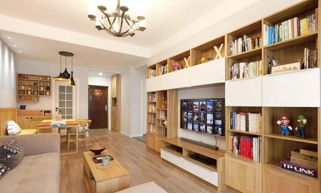 將書架和電視背景墻巧妙結合,整墻做書柜和儲物柜,能讓電視柜收納能力再升一級。書架部分可以做開放式,對培養孩子閱讀習慣非常好,甚至可以選擇不要電視以大書柜為家庭中心。