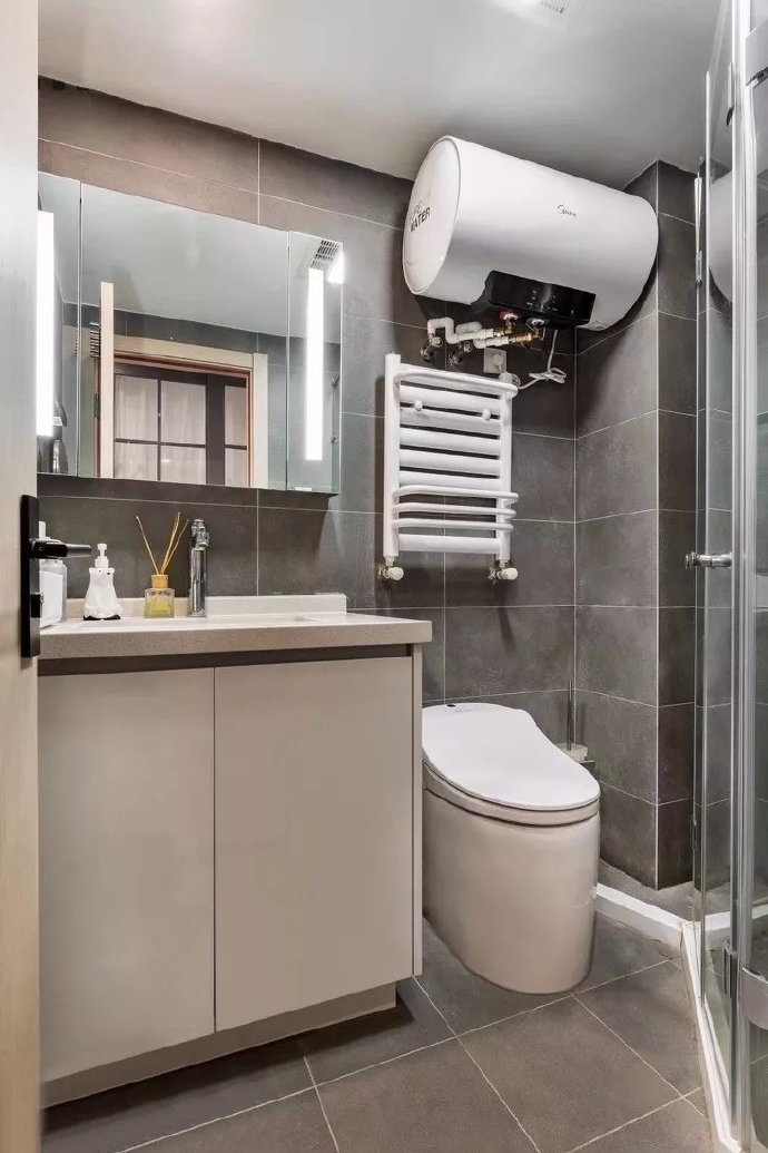 衛(wèi)生間,灰色調(diào)的地磚,乳白色調(diào)的洗手臺(tái),加上玻璃淋浴房設(shè)計(jì),讓整個(gè)衛(wèi)生間看起來(lái)時(shí)尚大氣。