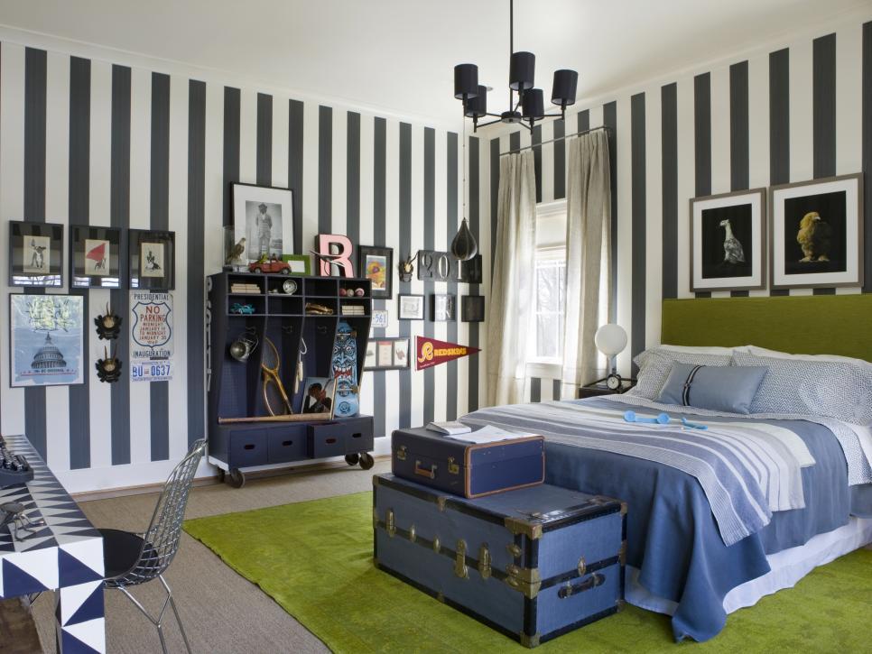 經典又好玩,條紋總是青少年男孩臥室的好選擇。在這個空間里,垂直條紋墻紙給房間帶來了高度和戲劇性。藍色的床上用品和行李箱,以及綠色的區域地毯,增添了一些受歡迎的色彩。