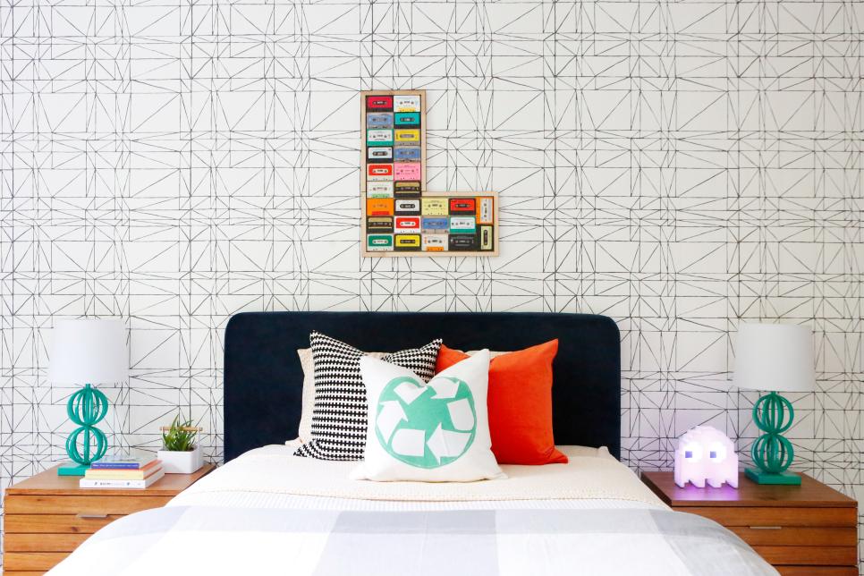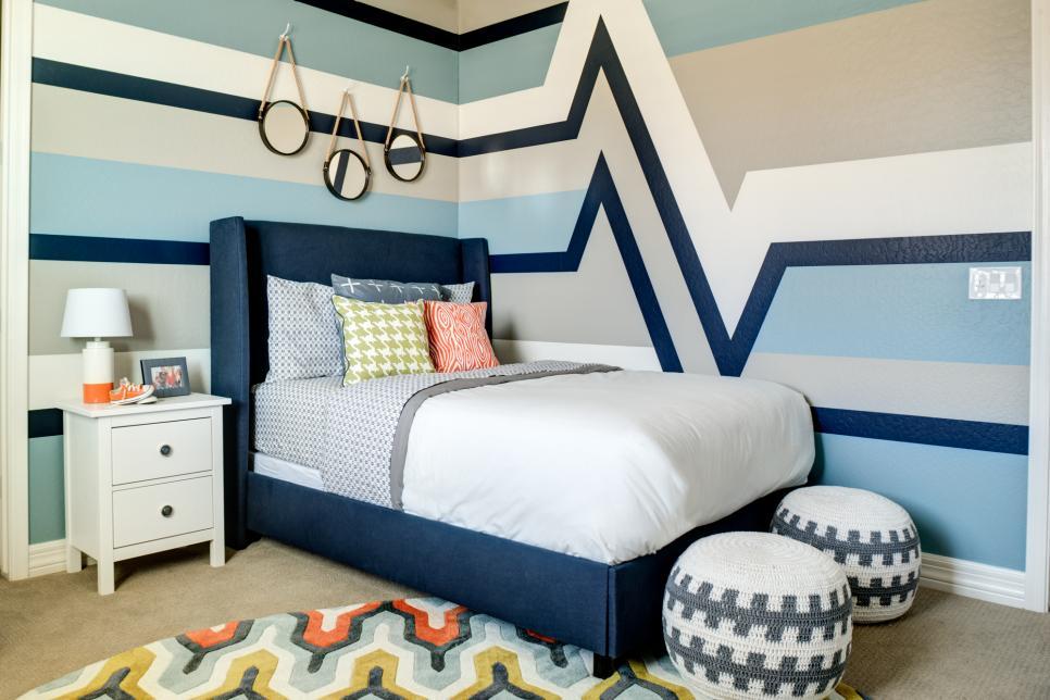 試著在墻上畫一個之字形圖案,就像在這個青少年臥室里看到的那樣。綠色、橙色和藍色的調色板一致,空間混合了各種各樣的圖案,看起來不會太擁擠。