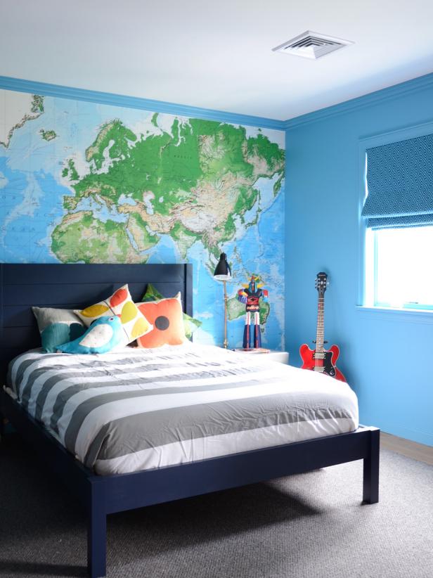 如果你不想用滿屋子的墻紙,那就在一面墻上試試。在一個青少年的房間里,一幅剝皮粘貼的壁畫很有特色,而且當他的品味發生變化時,它可以很容易地被移除。