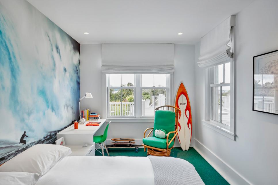 墻上的壁畫也可以使一個小空間感覺更大,就像在這個狹窄的青少年臥室看到的。一幅沖浪者的照片壁畫映襯著蒼茫的天空,讓空間感覺史詩般的壯麗,而深綠色的地毯和椅子增添了更多的深度和豐富的色彩。