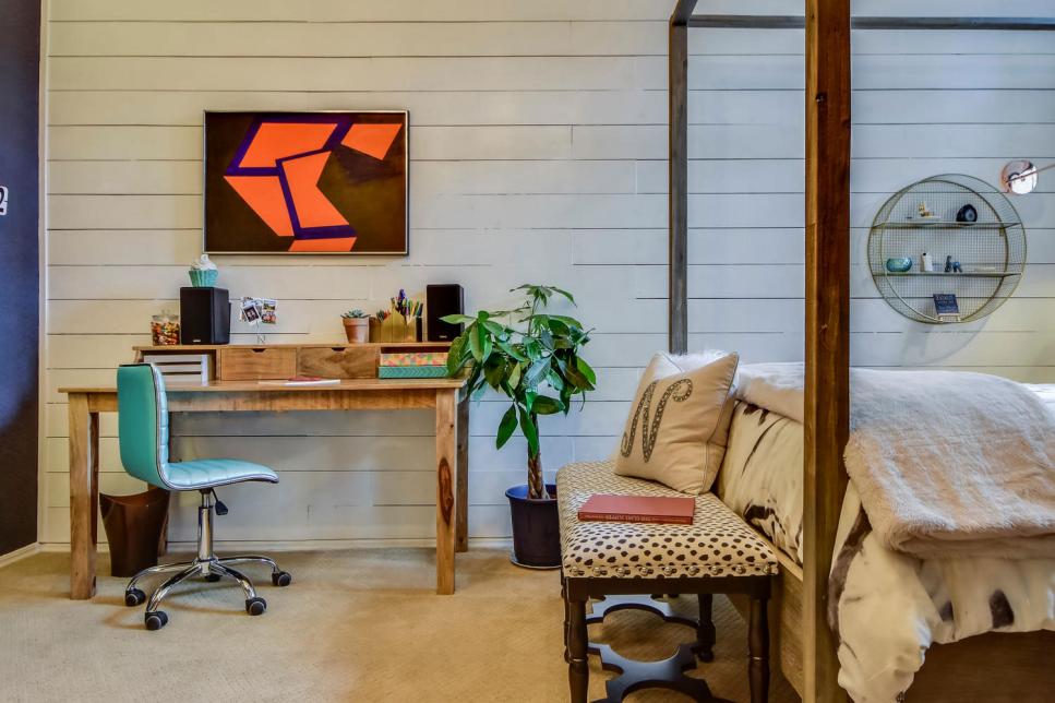 青少年可能對臥室里的主題不感興趣,但你仍然可以使用顏色、圖案和紋理來創造一個微妙的主題。質樸的色調、掛在墻上的鹿角和牛皮床頭板給這個房間帶來了一種不太夸張的西方氛圍。