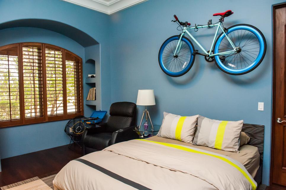 如果你沒有足夠的空間,用孩子的玩具、運動裝備和其他物品來裝飾是節省空間的好方法。在這個房間里,一輛藍色的自行車被安裝在床的上方,作為墻上的藝術品。
