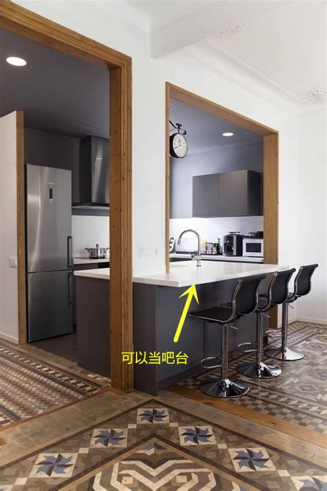 臺面可以加寬,上面可以放置做飯時要用到的一些用品,讓廚房操作的臺面變的更大。還可以當做小吧臺,門洞下擺放上座椅,就成了一個小吧臺,坐在這里吃早飯挺方便的。