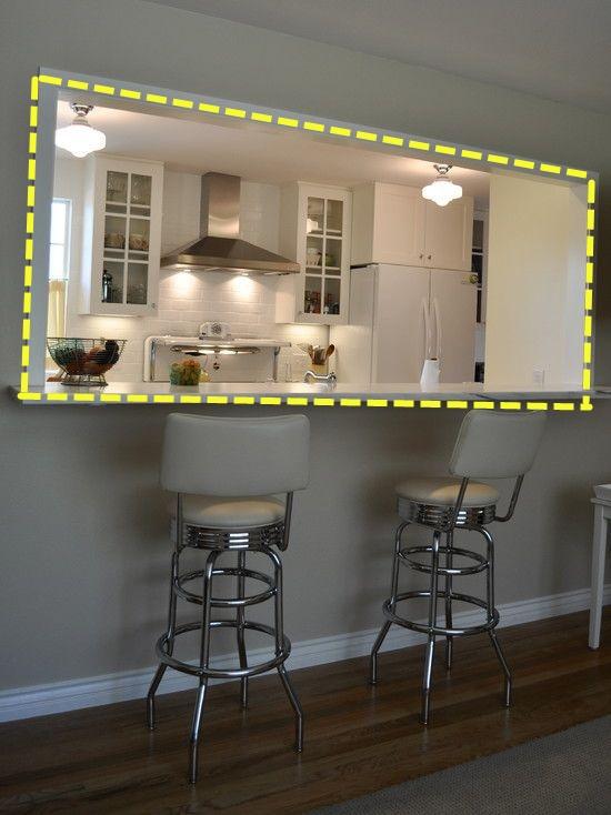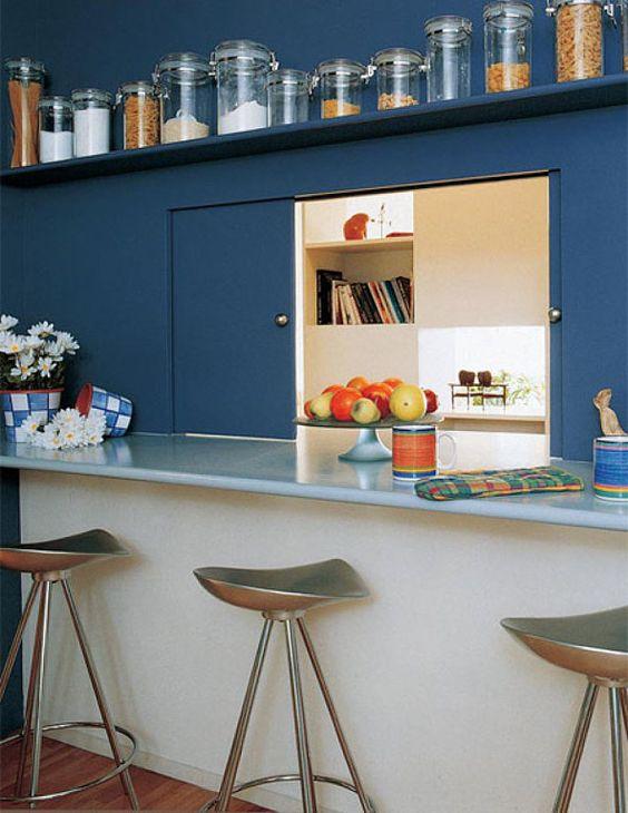 在廚房墻面開的門洞上安裝一個隱形窗,把窗刷成和墻漆同樣的顏色,可以很好的避免有油煙問題,不用的時候關起來,完全看不出來廚房墻面上開了一個門洞。