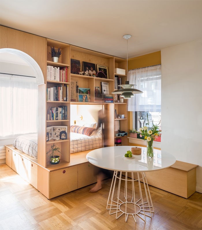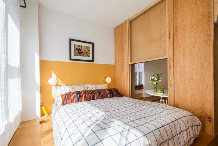除了可以在廚房墻面開個洞外,也能在臥室里開個小洞。直接用柜子做臥室和客廳的隔斷,在柜子上面開個洞,會讓臥室的空間變的更加通透。不過要用磨砂的玻璃,能保護個人隱私。尤其是小戶型的房子,可以試試這樣的設計哦!