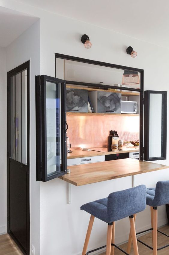 也可以在門洞上安裝上推拉窗,再加上鏤空的設計,就能制造一個實用與美觀兼顧的吧臺。