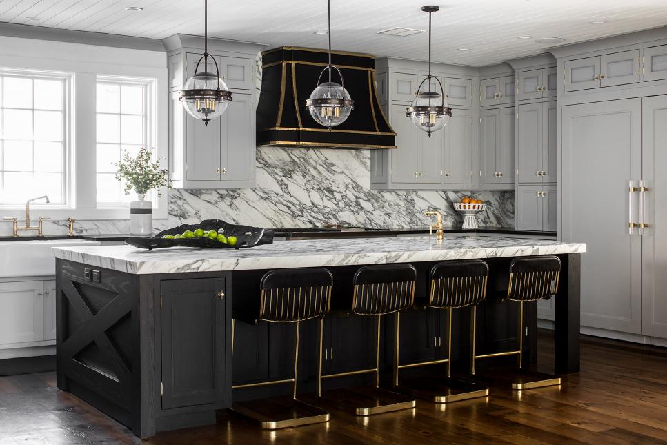 這個時髦的廚房有著豪華皮革酒吧凳和金色的排油煙機。黃金色吊墜和五金件完美搭配。