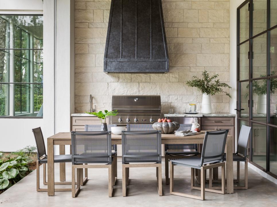 帶著排油煙機,讓你的戶外廚房更上一層樓。它的金屬罩有一種非常漂亮的顏色,在象牙磚的襯托下顯得非常漂亮。