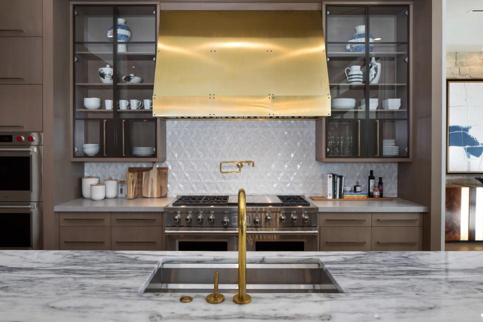 這個廚房從超級奢華的好萊塢風格得到了大量的設計靈感——尤其是引人注目的黑色抽油煙機。這是一個華麗的廚房帶有鍍金的裝飾。