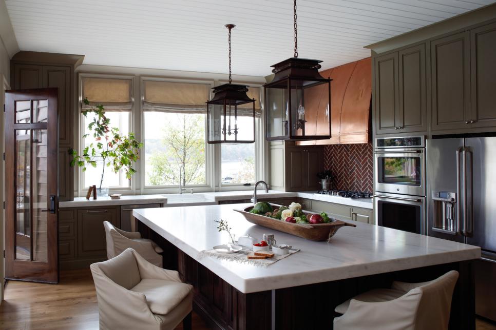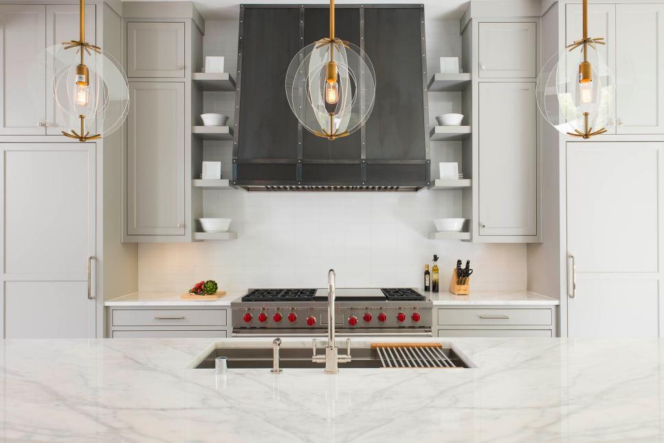 喜歡大理石臺面嗎?大理石抽油煙機怎么樣?我喜歡這個廚房被兩盞吊燈環繞的樣子,以此來照亮和聚焦大理石。